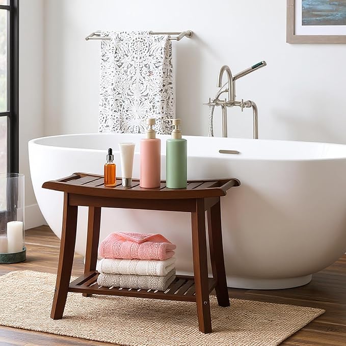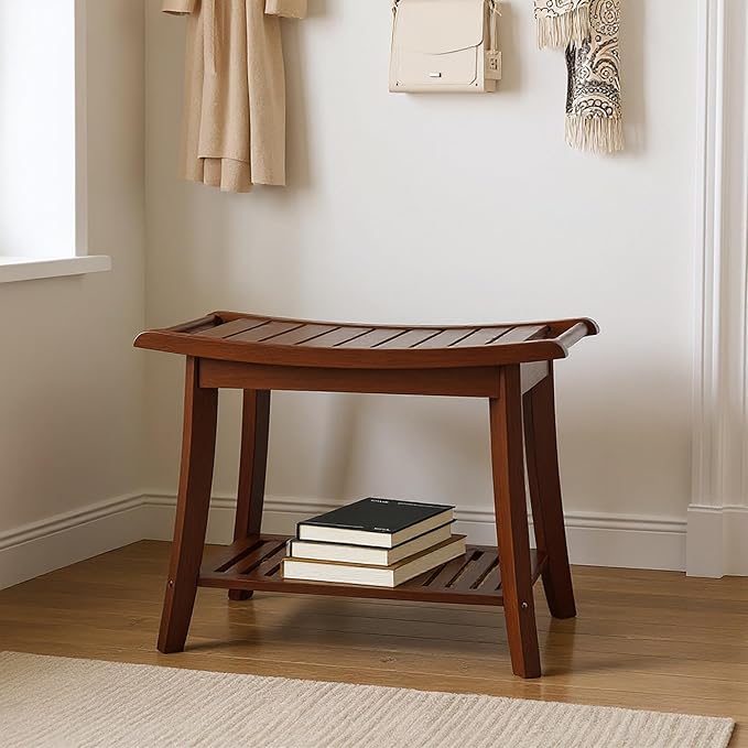 Bamboo Shower Bench Stool,24" Shower Chair Seat Non-Slip,Waterproof Bathroom Bench with Storage Shelf for Adults,Elderly, Disabled Indoor&Outdoor Use (Walnut)