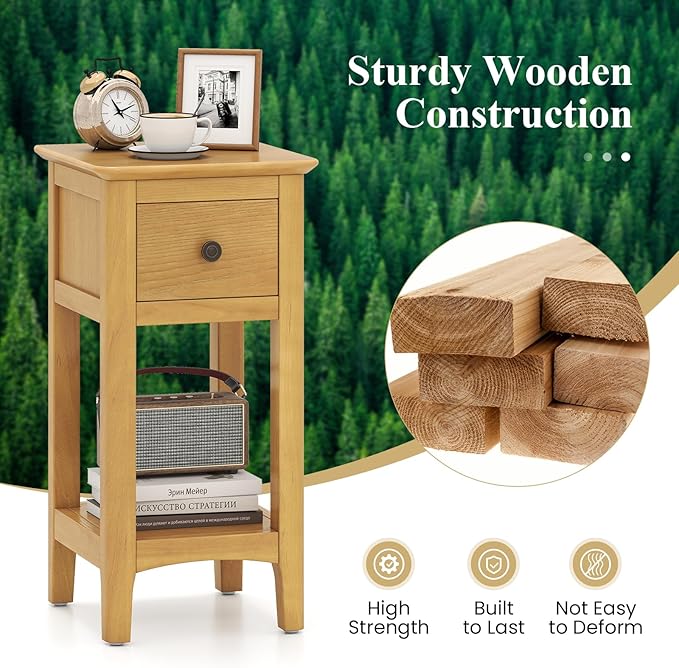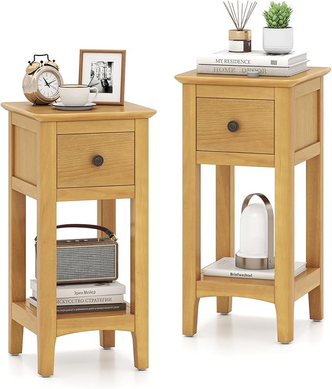 Giantex Narrow End Tables with Drawer Set of 2, 23.5" H Side Table w/Open Storage Shelf & Solid Wood Frame, Small Night Stands for Dorm Living Room, Bedroom, Small Spaces, No Assembly Needed, Natural