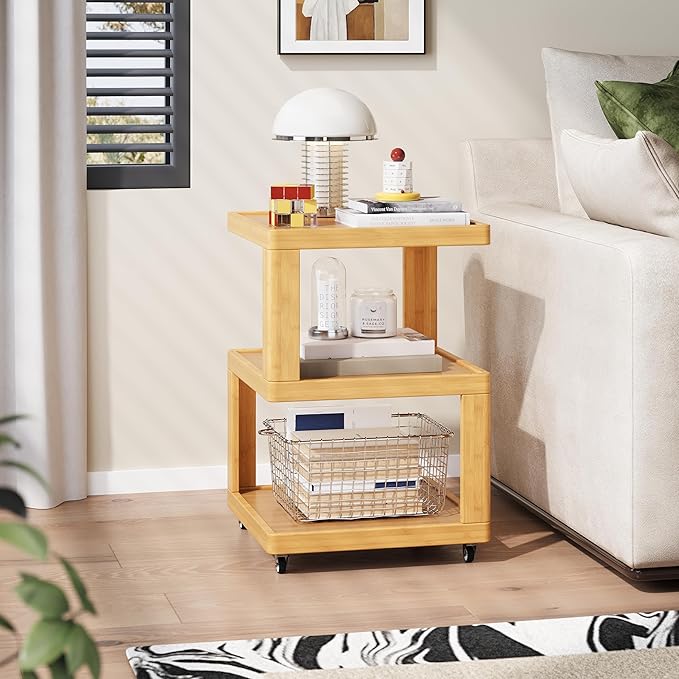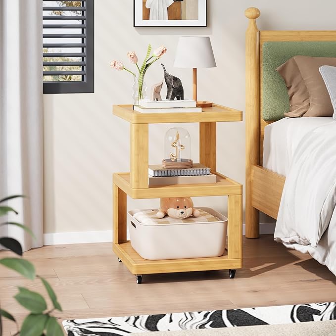 ZIYOO 3-Tier Solid Wood Mobile Side Table with Wheels, Wooden Night Stand, Unique Floating Design Storage Organizer for Bedroom, Living Room, Small Spaces, Natural Bamboo