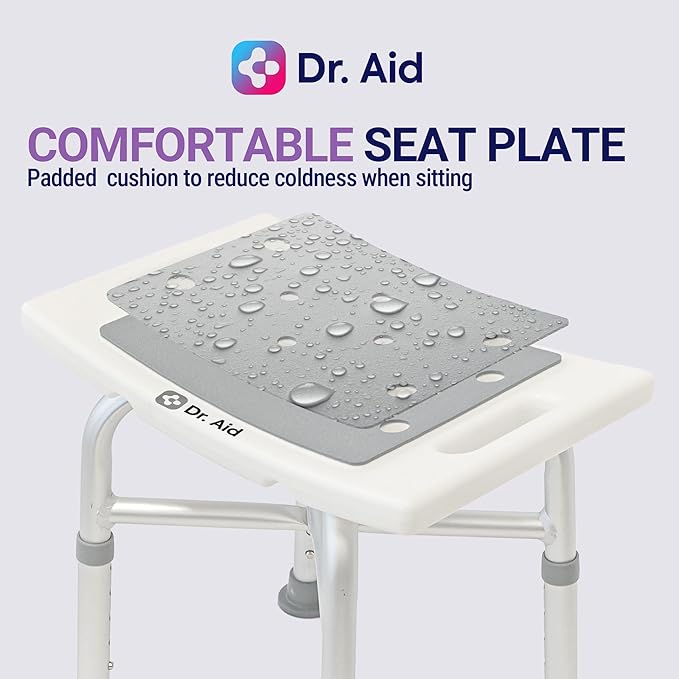 - Strong, Reliable & Lightweight: Made from high-quality, rust-resistant aluminum, the Dr. Aid shower stool offers dependable support for up to 400 lbs (with 220 lbs recommended for long-term daily use). The reinforced crossbar frame adds balance and strength, giving seniors and adults a stable, confident bathing experience.