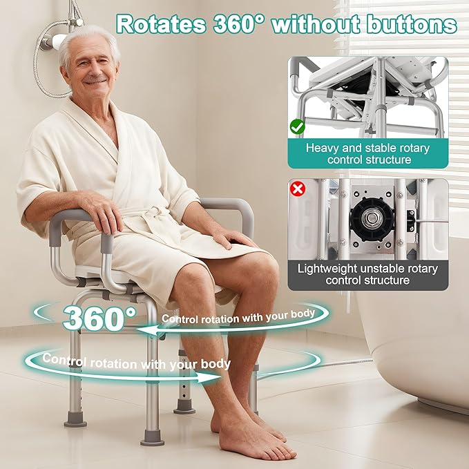 - 【360° Full-Rotation Seat】Experience effortless entry and exit with the 360° rotating seat. This shower chair pivots with your body's movement, allowing comfortable positioning without straining your back or knees. It provides an ideal solution for seniors and individuals with mobility challenges, ensuring every shower is simple and safe.