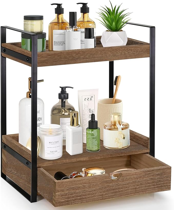 2-Tier Bathroom Organizer Countertop with Drawer, Wood Counter Shelf for Storage, Vanity Tray for Organization and Decor, Countertop Organizer for Bathroom, Kitchen, Office (Dark Brown)