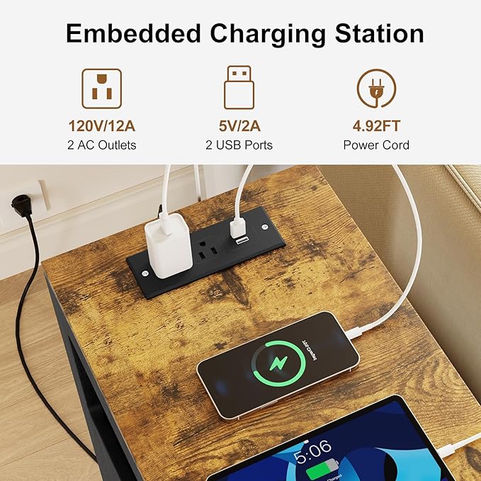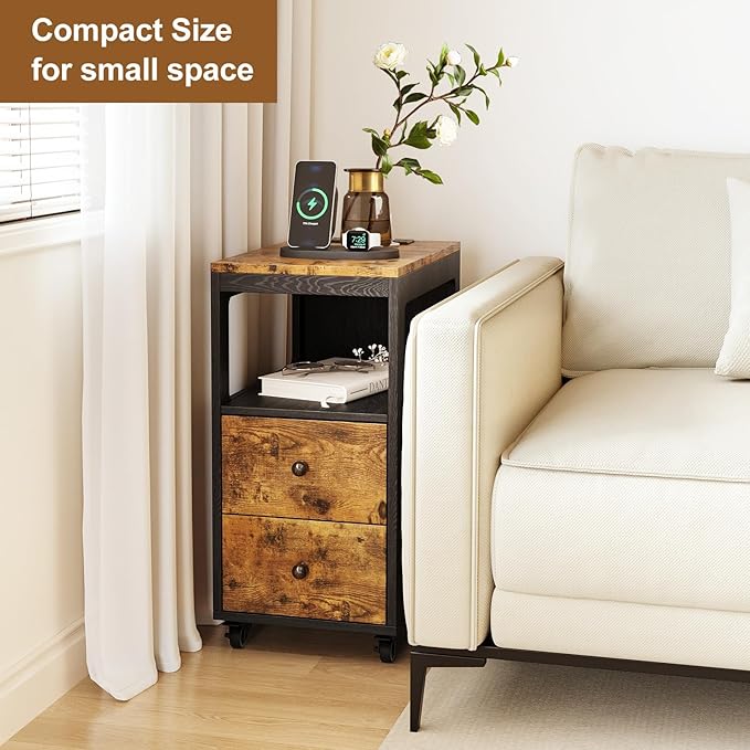 Narrow End Table with Charging Station and Wheels, Movable Narrow End Table with USB Ports and Outlets for Small Space, Living Room, Bedroom and Office, with 4 Wheels ( Rustic Brown + Black)