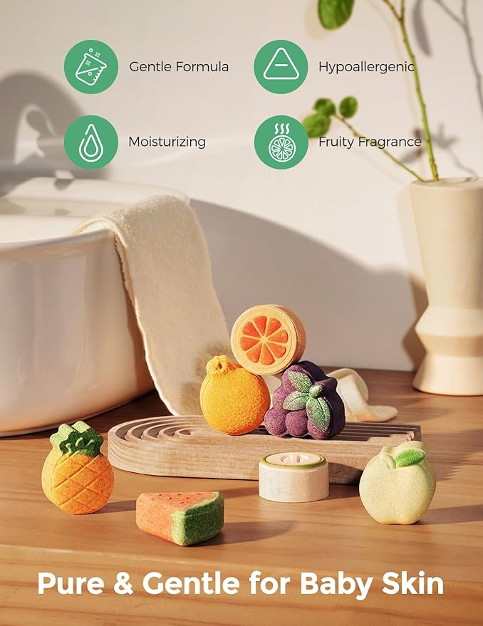 - đżăTeach in Fun wayăMomcozy bath bombs are not just fun but also educational! Each bath bomb comes in a different fruit shape, allowing kids to learn about fruits while enjoying their bath. Plus, each set includes an fruit card for an even more interactive experience. Perfect for toddlers and kids who love learning through play.