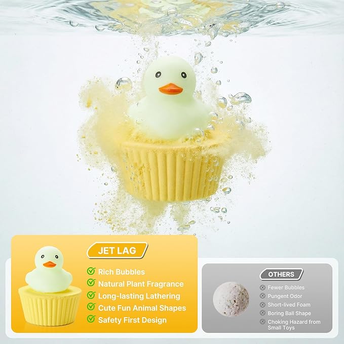 JET LAG 9PCS Cute Duck Bath Bombs for Kids, Handmade Fizzies Bathbombs for Women, Natural & Kids Friendly - Cupcake Gift Set for Birthday Christmas Easter Valentine's Day