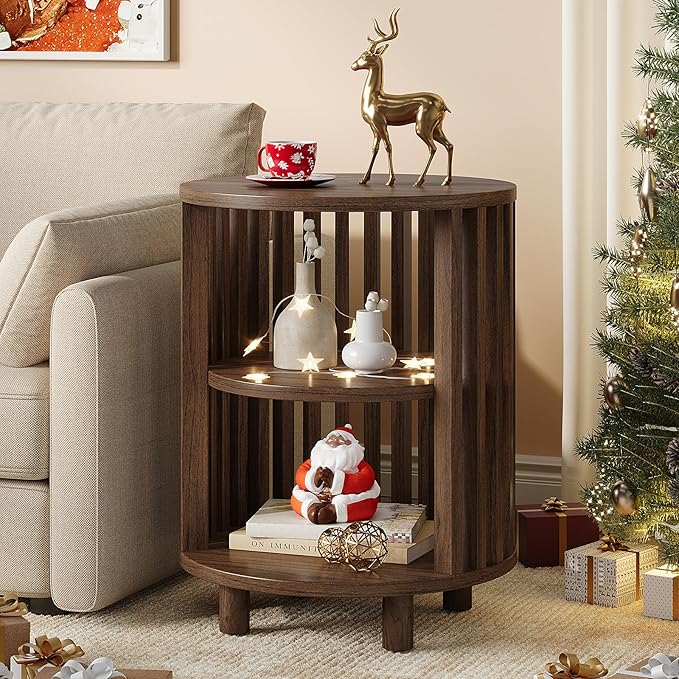 Round End Table, Wood Bedside Table, Mid Century Modern Nightstand with Open Storage Shelf, 3 Tier Small Side Tables for Living Room, Bedroom, Curved Profile Design, Walnut(1-Pack)