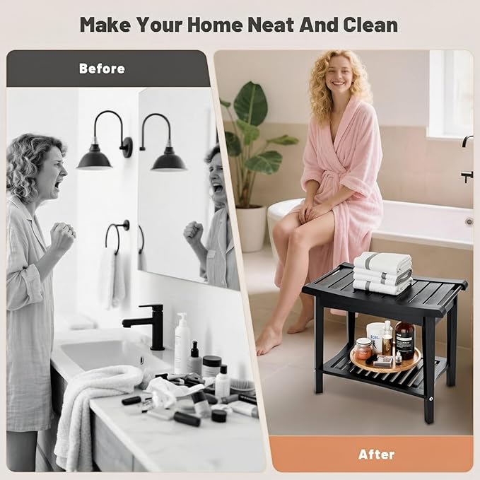 - [Multi-Function 2-Tier Storage Design]This bamboo corner shower bench features a 2-tier shelf for organizing towels, bottles, and bath essentials. Integrated handles make it easy and safe to reposition, while also doubling as a convenient spot to hang towels for added functionality.